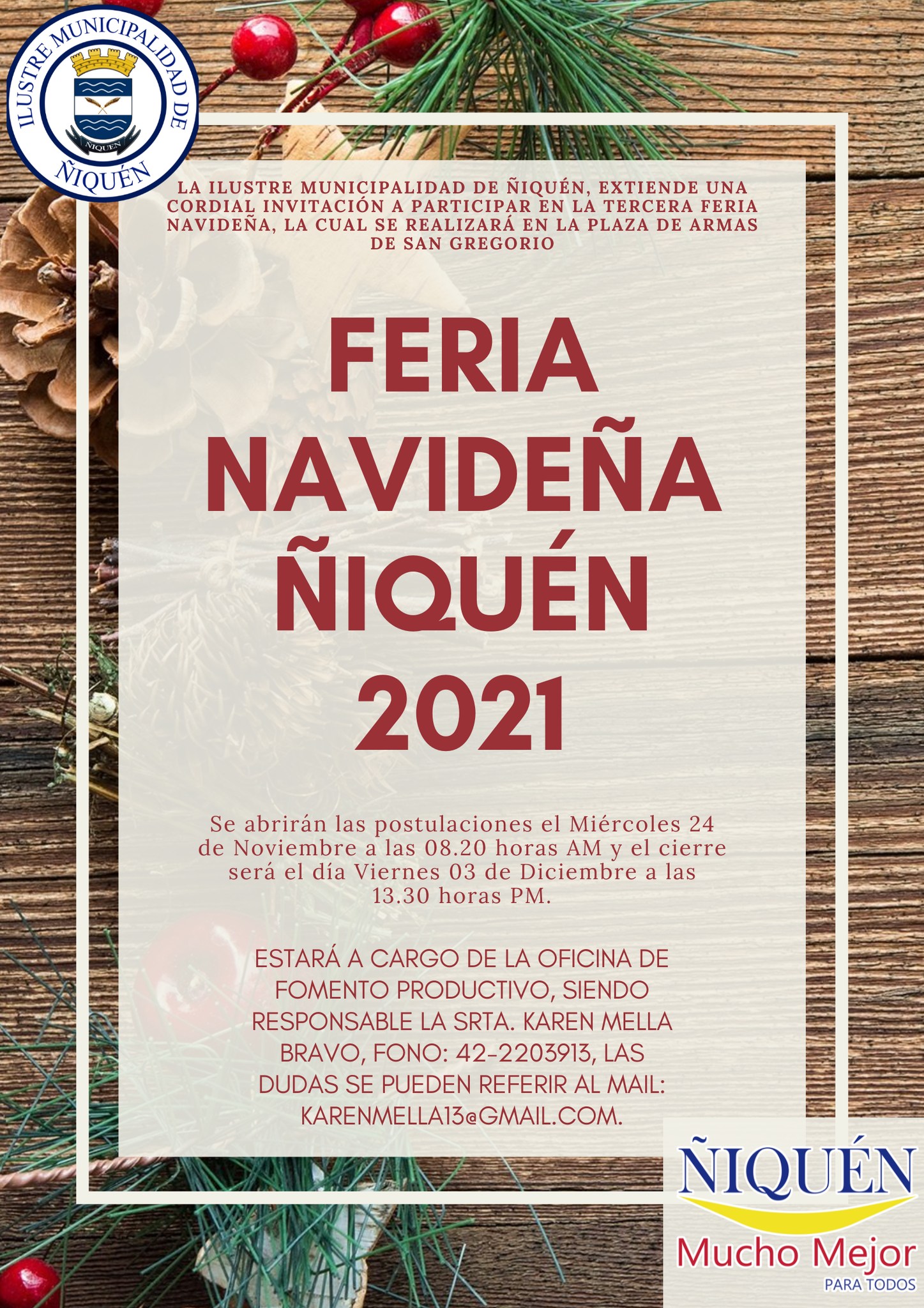 La Ilustre Municipalidad de Ñiquén, extiende una cordial invitación a participar en la Tercera Feria Navideña, la cual se realizará en la Plaza de Armas de San Gregorio. Las postulaciones deben realizarse de acuerdo a las siguientes consideraciones: